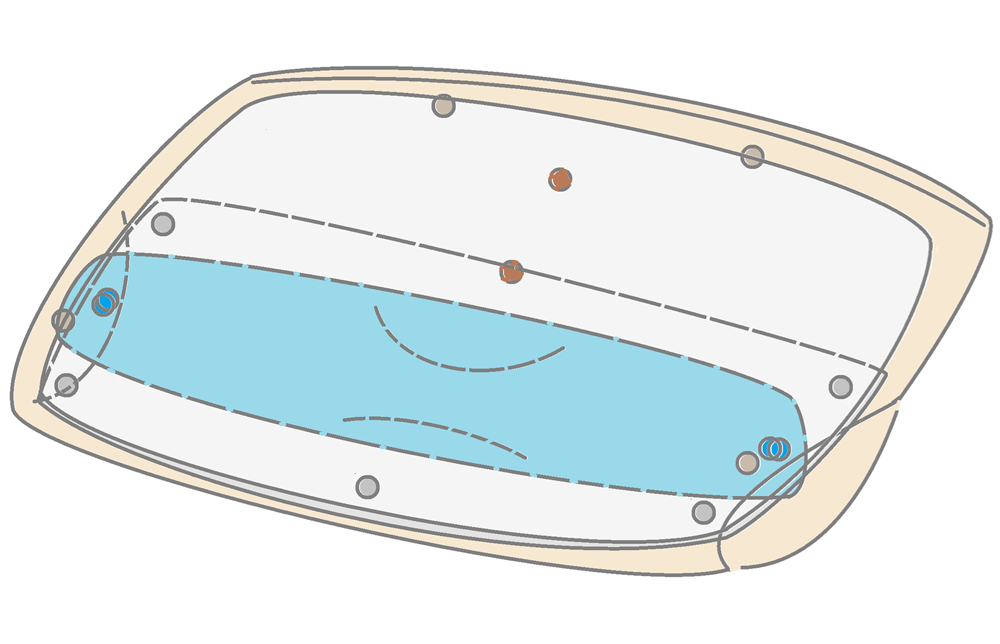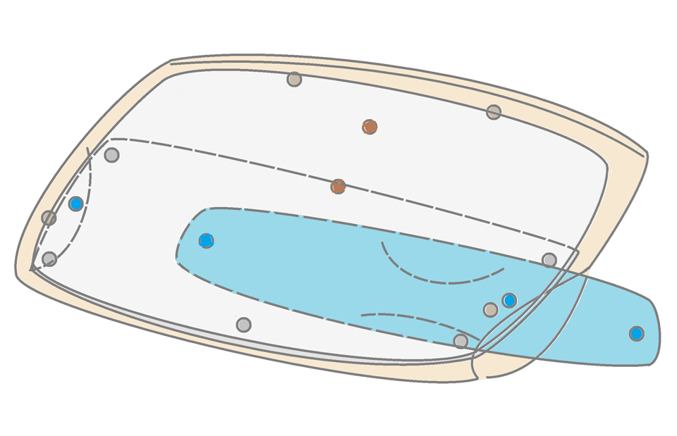 상하판이 통합되어 있으며 하판 중앙에는 머리가 낮게 놓이는 'button pit'이 설치되어 있습니다.